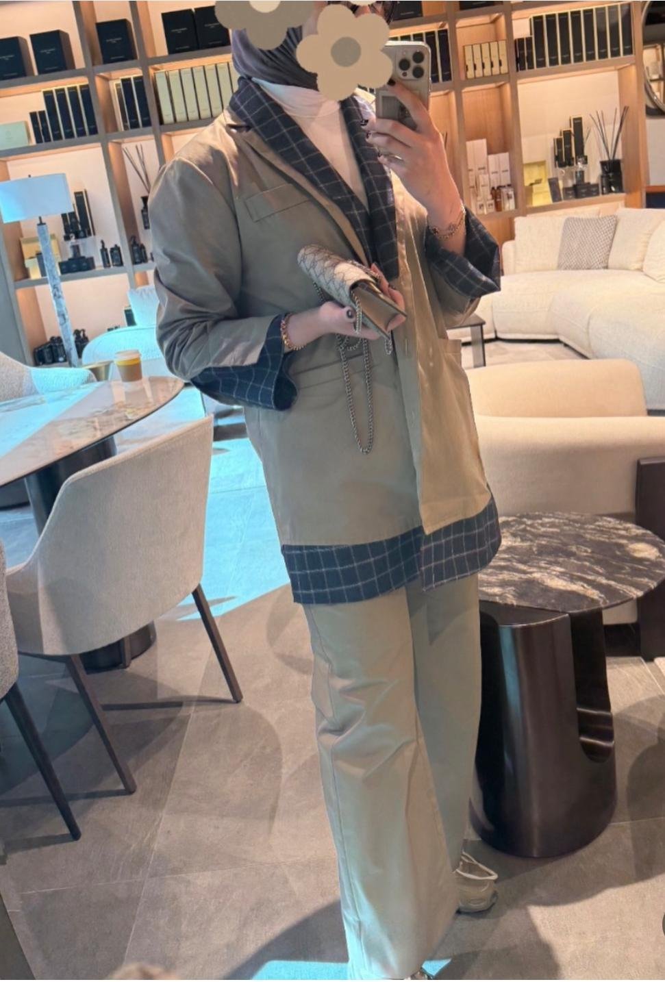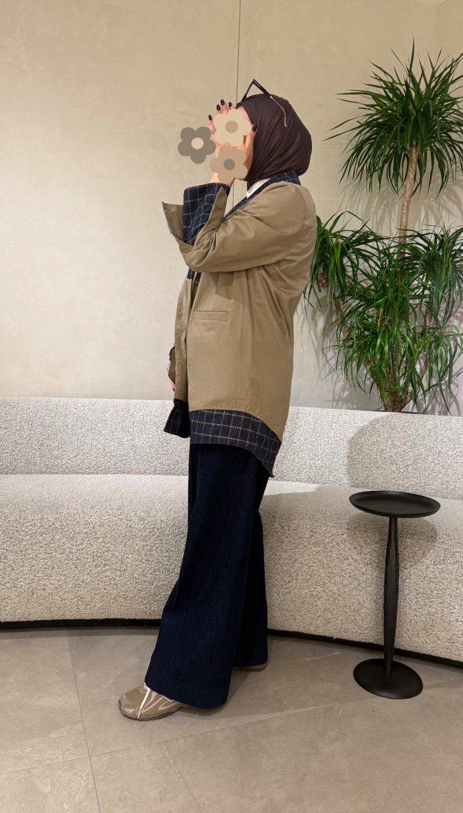 Trench top with attached navy check shirt-style lining